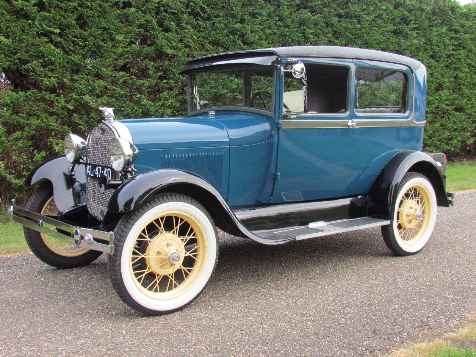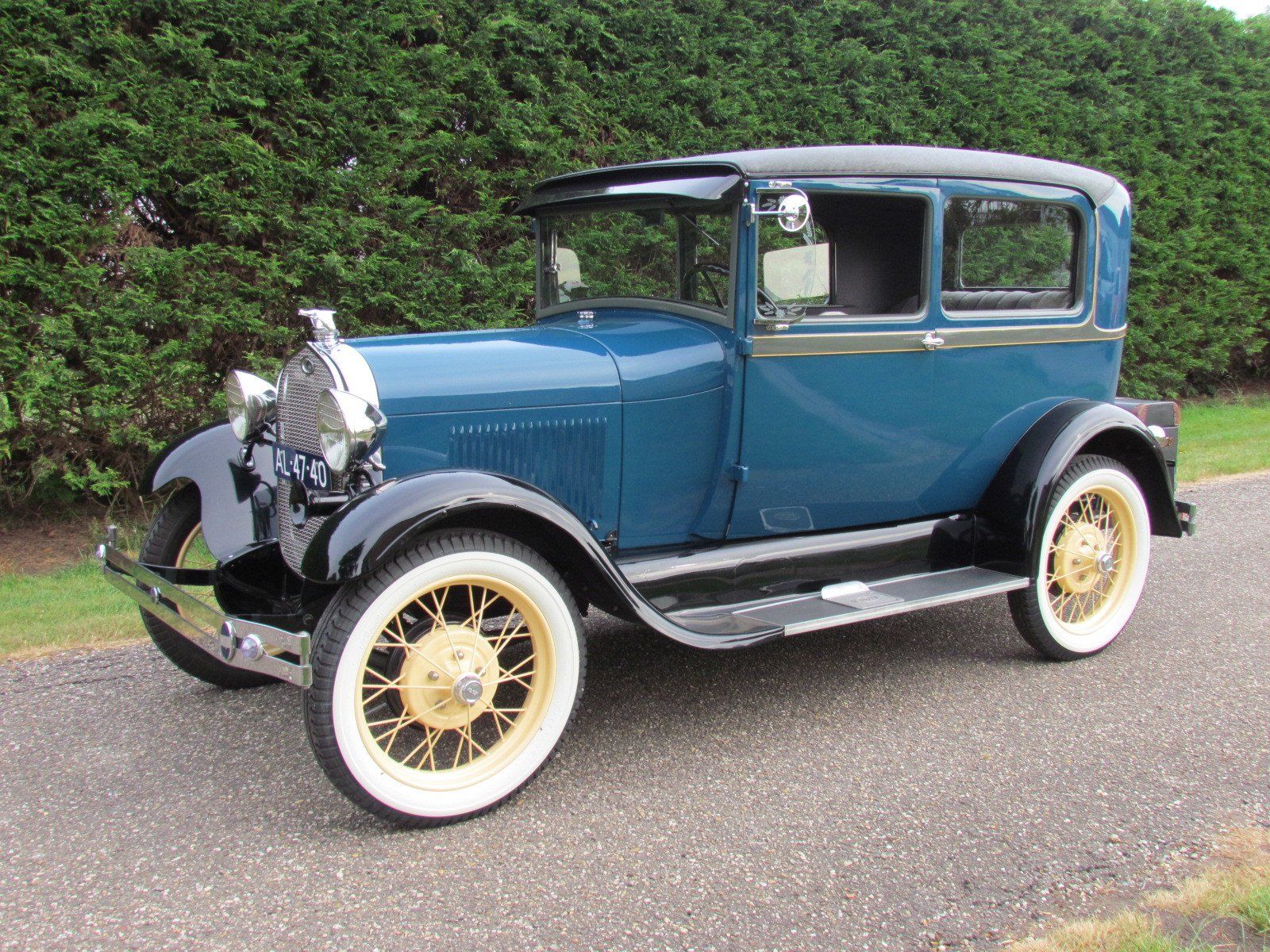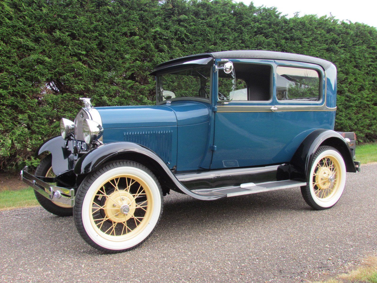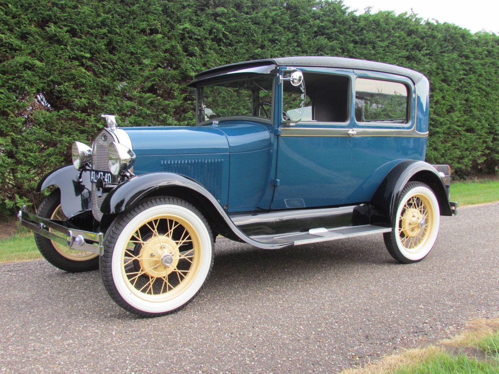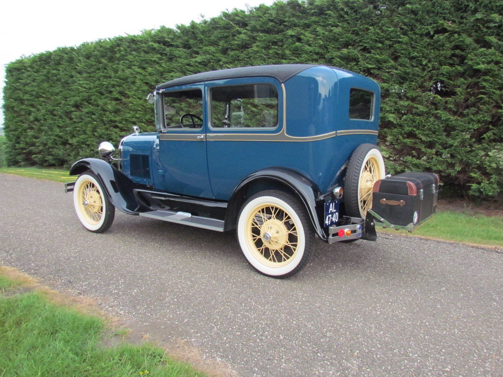 Volledig gerestaureerde A-Ford 2 deurs sedan met mooi strak plaatwerk en lakwerk. De auto heeft nieuwe velgen met zeer goede en nette wide white wall Firestone banden. Als accessoires heeft de auto een bagagerek met koffer en op de treeplank een toolbox met gereedschap.